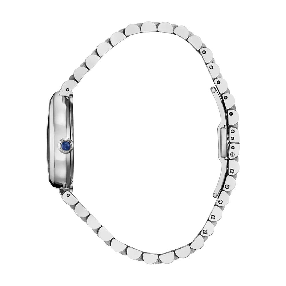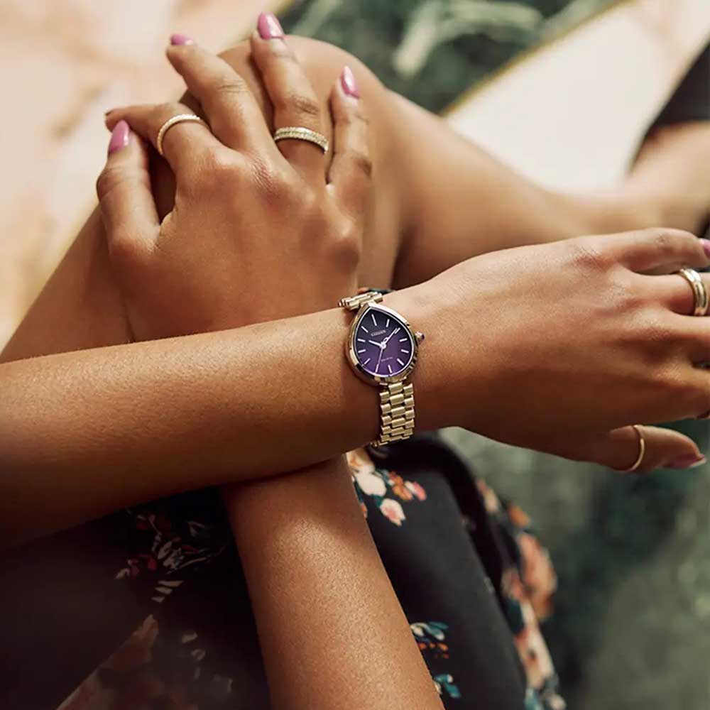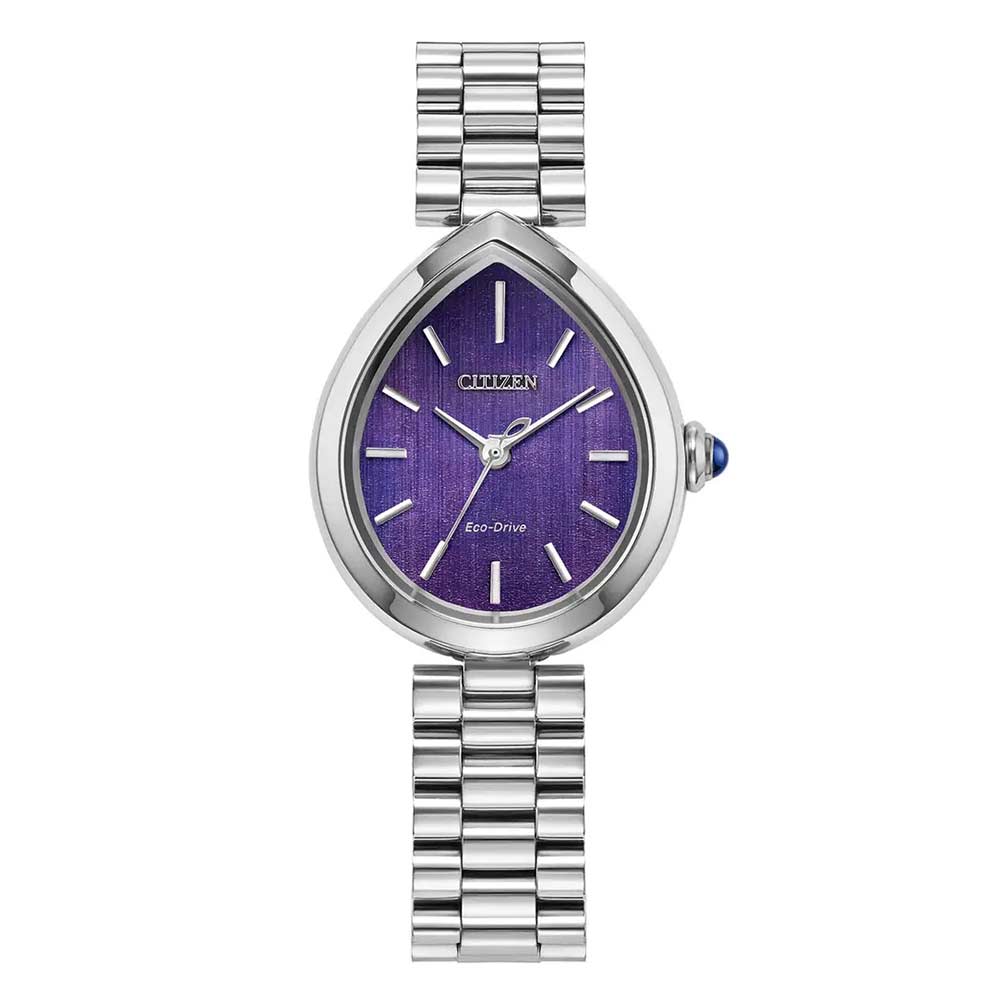This refined timepiece features a graceful 26mm x 31mm silver-tone stainless steel case, paired with a matching bracelet for a seamless look. A synthetic sapphire-set crown adds a subtle touch of luxury. The rich purple dial mirrors the case shape with a brushed finish, complemented by applied indices and coordinating hands. Powered by Citizen’s proprietary Eco-Drive technology, the Rainell runs on any light and never requires a battery. Water resistant up to 50 metres for everyday confidence.