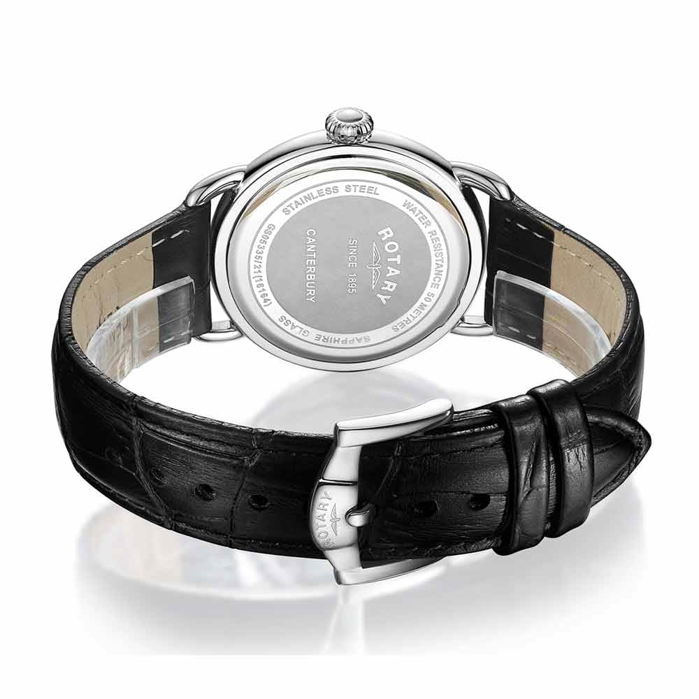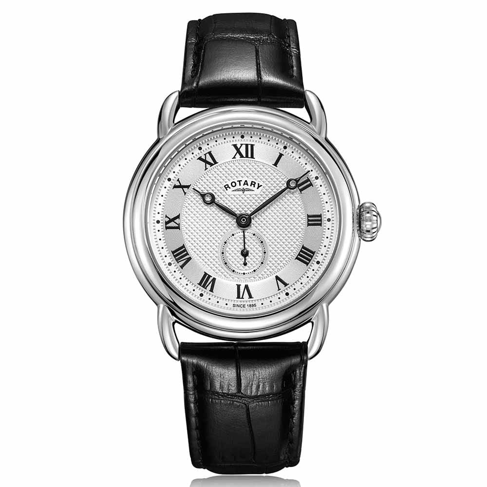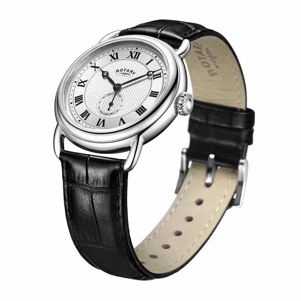Powered by a reliable quartz movement, this Rotary Heritage “Sherlock” includes a running seconds sub-dial that enhances its vintage-inspired dial layout. The finely detailed dial adds depth and texture, beautifully contrasting with the classic numerals and hand-set design. Completing the look are wire-style lugs and an ornate crown, both nods to traditional watchmaking craftsmanship.