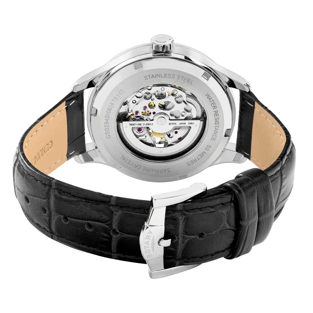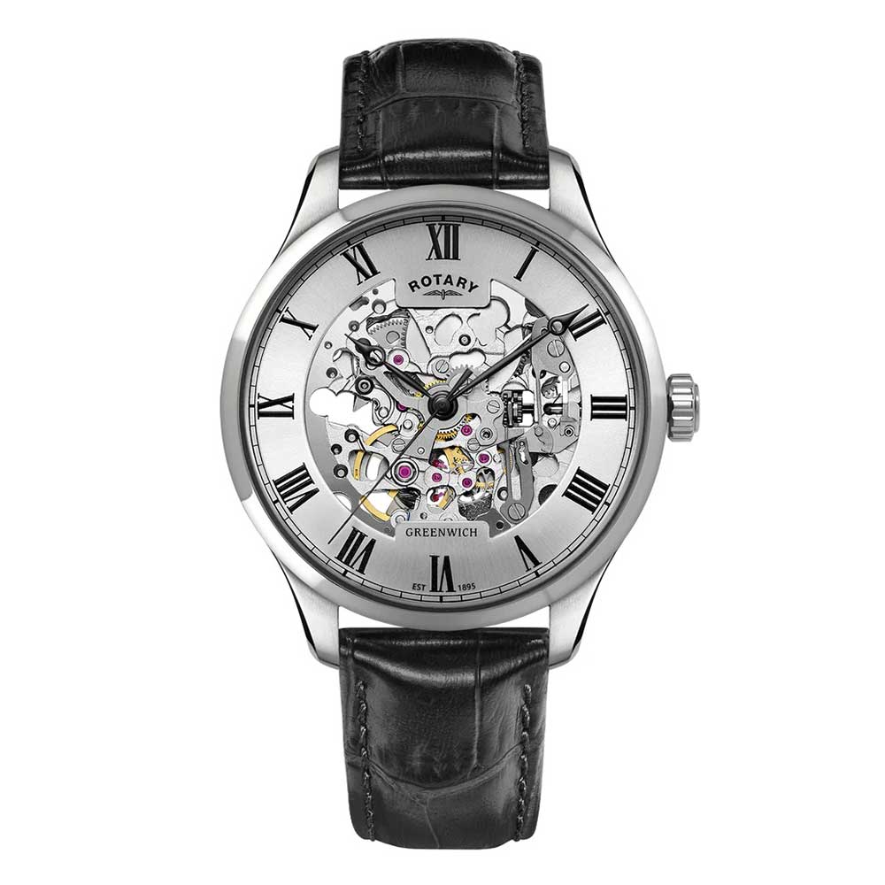 Designed for those who admire the craft behind fine watchmaking, the Rotary Greenwich showcases the brand’s enduring heritage and mechanical expertise. The 42mm polished stainless steel case frames a striking skeleton dial, offering a captivating view of the automatic movement at work.